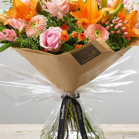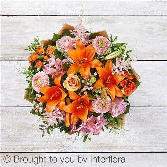 Featuring orange LA lilies, peach and pink large headed roses, pink alstroemeria, pink astilbe, pink germini, peach hypericum and orange spray roses, hand-tied with thlaspi, pistache and salal, and presented in Interflora Gift Packaging.