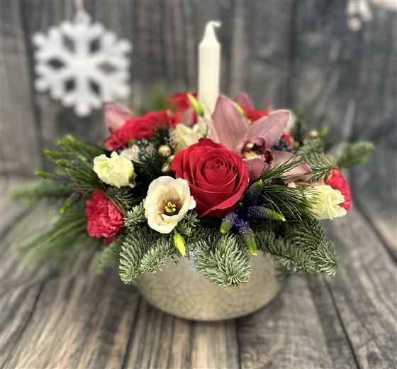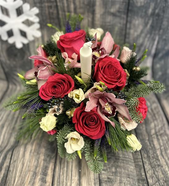 This arrangement is stylished displayed in a gold ceramic pot. It includes seasonal roses, lisianthus, veronica, orchids and foliage. It is finished off with a tapered candle.