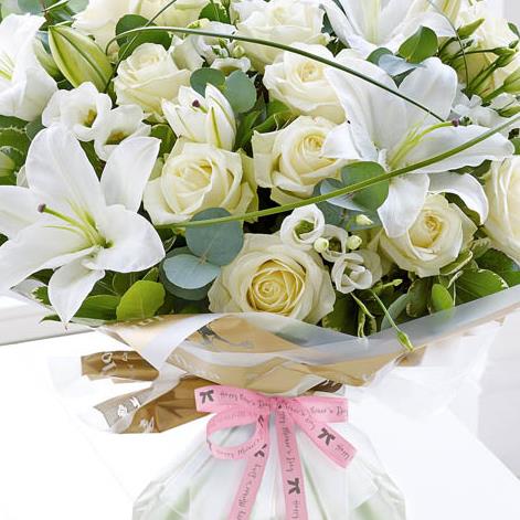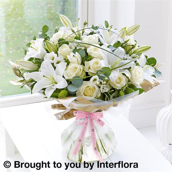 Featuring white large-headed roses, with white Oriental lilies and white lisianthus hand-tied with steel grass, salal, eucalyptus and pittosporum, wrapped and trimmed with 'Happy Mother's Day' ribbon and presented in Interflora Gift Packaging.