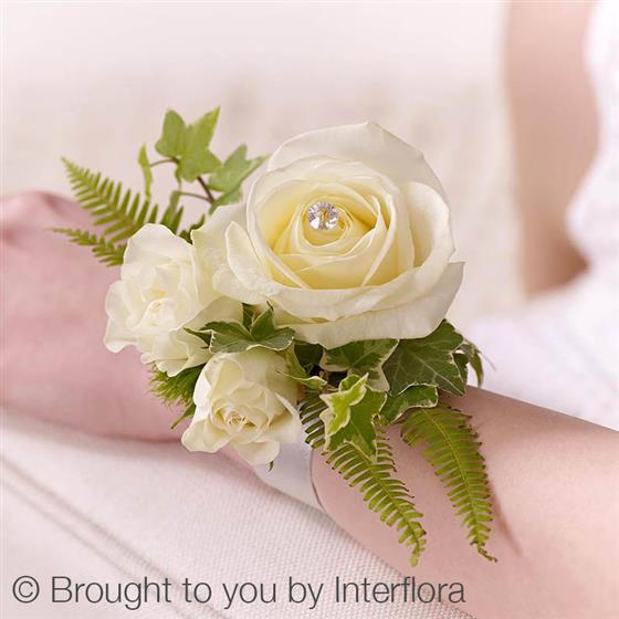 Featuring an ivory rose and cream spray rose heads with variegated ivy and fern arranged on a white wrap wristlet and finished with a diamante pin.