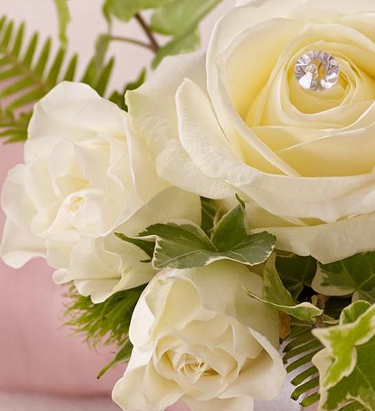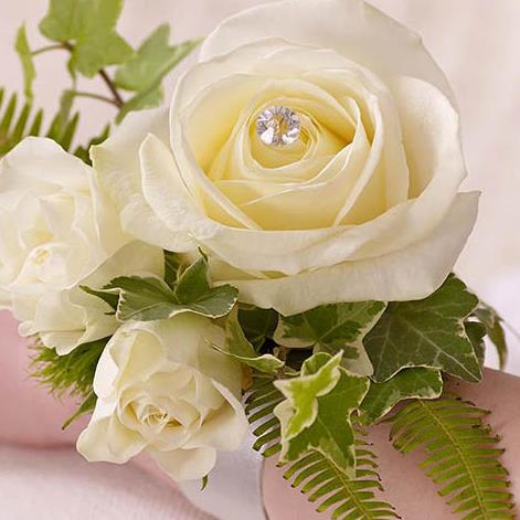 Roses are an eternally popular special occasion flower – timeless and full of beauty. To create this elegant wrist corsage we’ve used ivory roses with delicate foliage and a decorative diamante pin for extra sparkle.