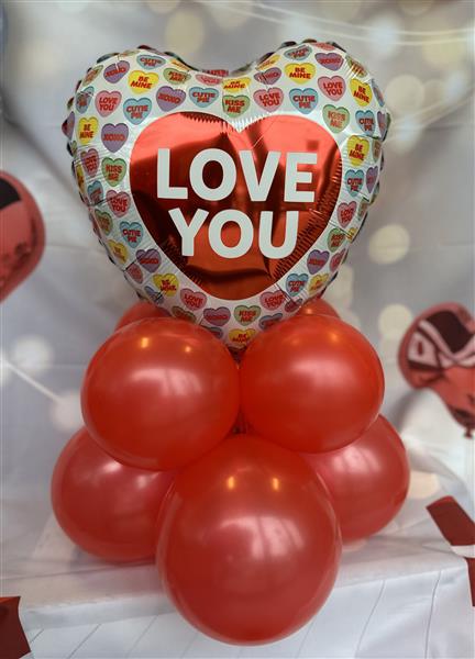 A beautiful, fun balloon stack with red latex balloons at the bottom topped with a LOVE YOU heart shaped balloon on top.