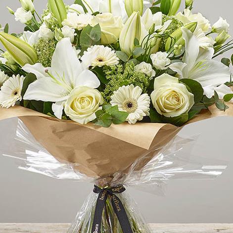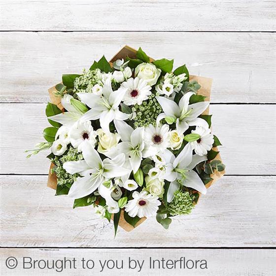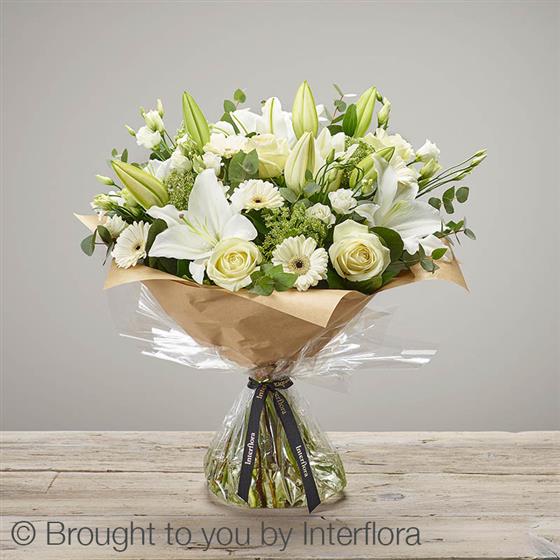 Featuring white germini, white Oriental lilies, white lisianthus, white large-headed roses and white ammi, hand-tied with eucalyptus and salal, presented in Interflora Gift Packaging.