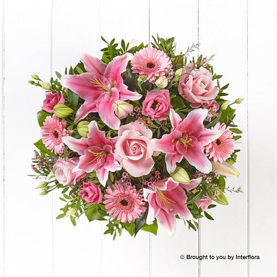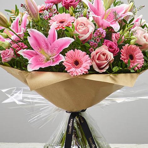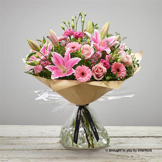 Featuring pink Oriental lilies, pink large-headed roses, pink lisianthus and pink germini, hand-tied with eucalyptus and salal.