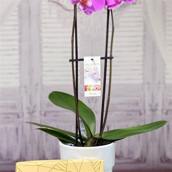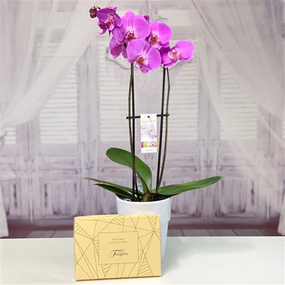 Phalaenopsis (Moth Orchid)Pronounced fal-a-nop-sis. Comes from Greek phaluna meaning a moth and opsis meaning resemblance. This beautiful pink orchid is delivered in a cream ceramic vase and come with a luxury box of Belgium chocolates.