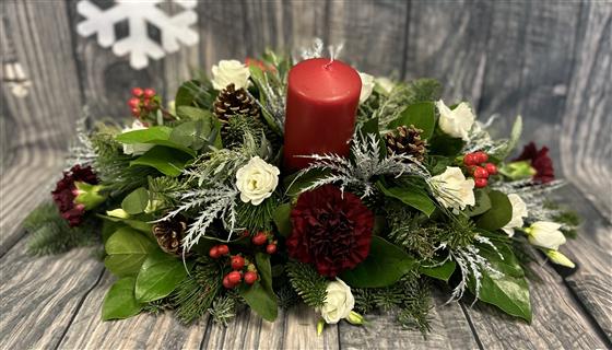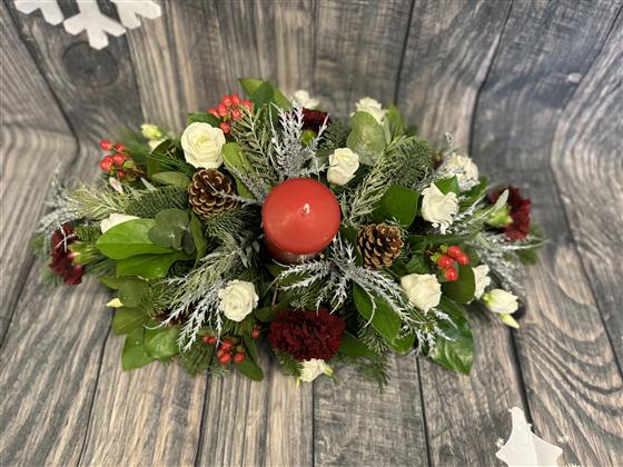YOu are planning a Christmas Festive Celebration and you have everything planned but there is one thing you know you need to make it perfect. You do not need more decorations, no more food, no more twinkly lights. Look no further, what you are looking for is the Shining Star. The Shining Star includes a rnage of seasonal carnations, hyperisum, lisianthus and foliage. Finished off with a pillar candle and some festive decoration.
