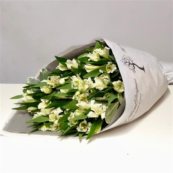 A gift wrap of long stemmed White Alstroemeria's. Wrapped in 100% Biodegradable paper and tissue.