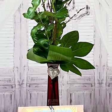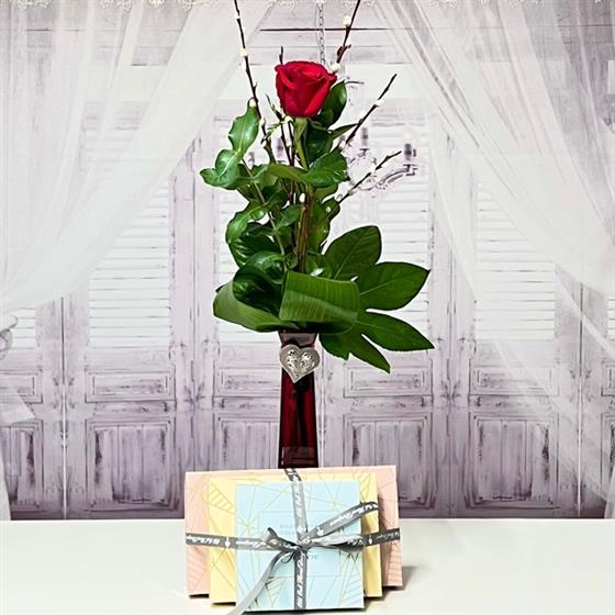 A single red Rose gift presented in a red vase a touch of seasonal foliage, with a trio of Chocolates.