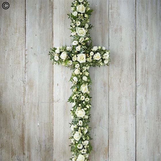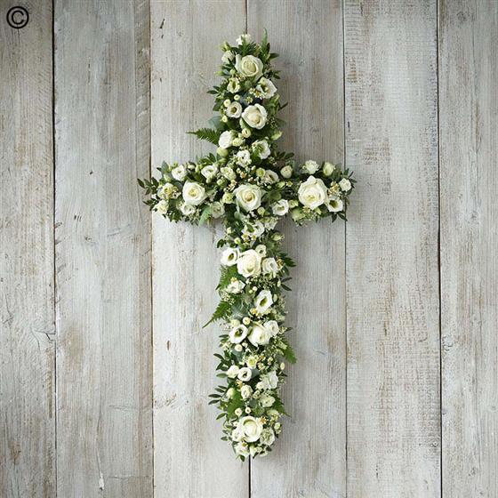 An elegant cross that contrasts an array of white blooms, including roses, chrysanthemums and limonium, with beautiful foliage